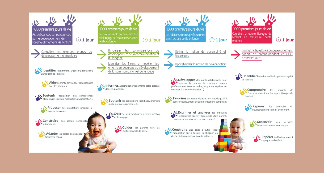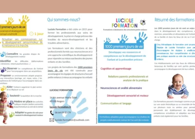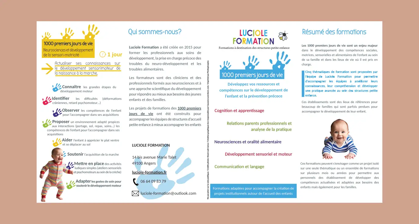 Luciole Formation, groupement de professionnels en Formation continue en kinésithérapie pédiatrique et pédiatrie souhaite développer une offre pour les crèches autour des 1000 premiers jours de vie. Pour développer cette nouvelle offre, ils ont souhaité un dépliant spécifique.