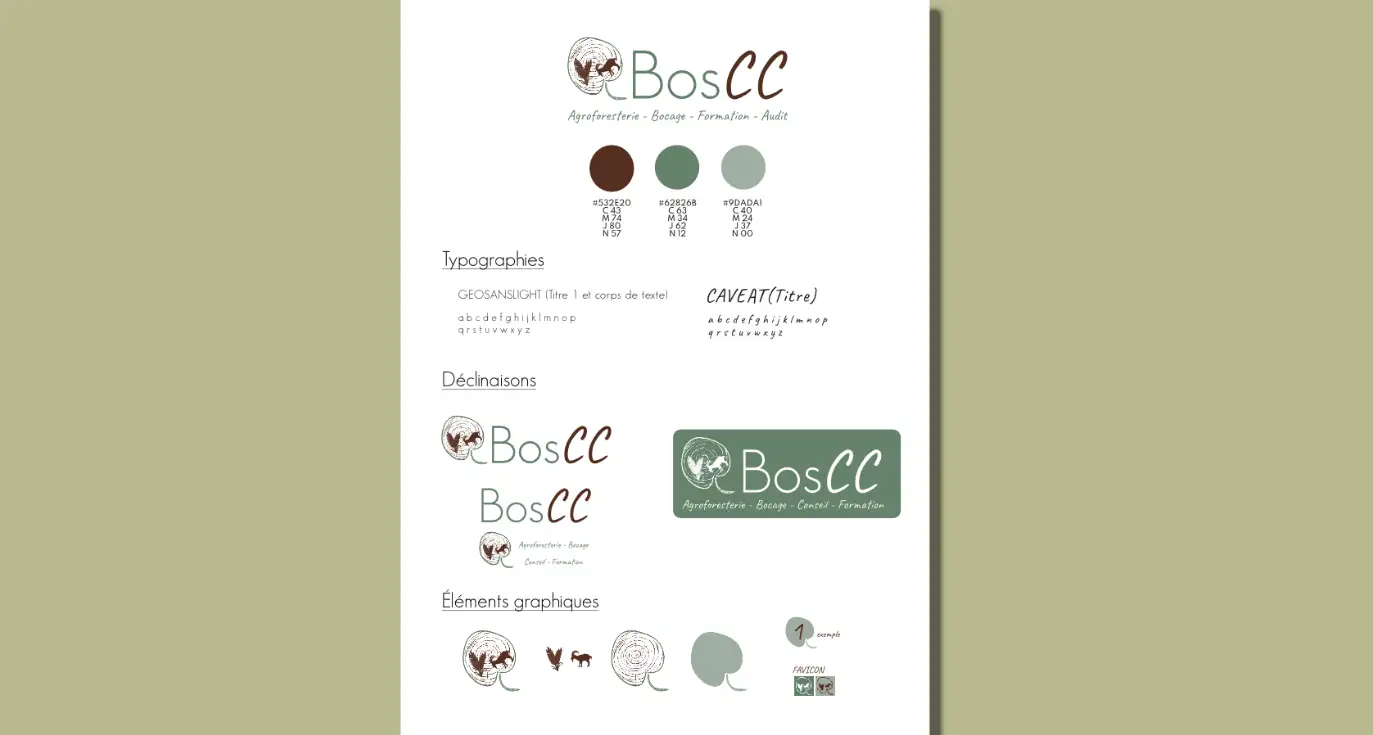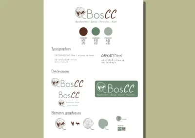 Le logo de BosCC a été créé d’après une idée de la cliente. C’est une idéntitée visuelle co-consrtuite avec la cliente car elle avait une idée assez précise pour son logo.