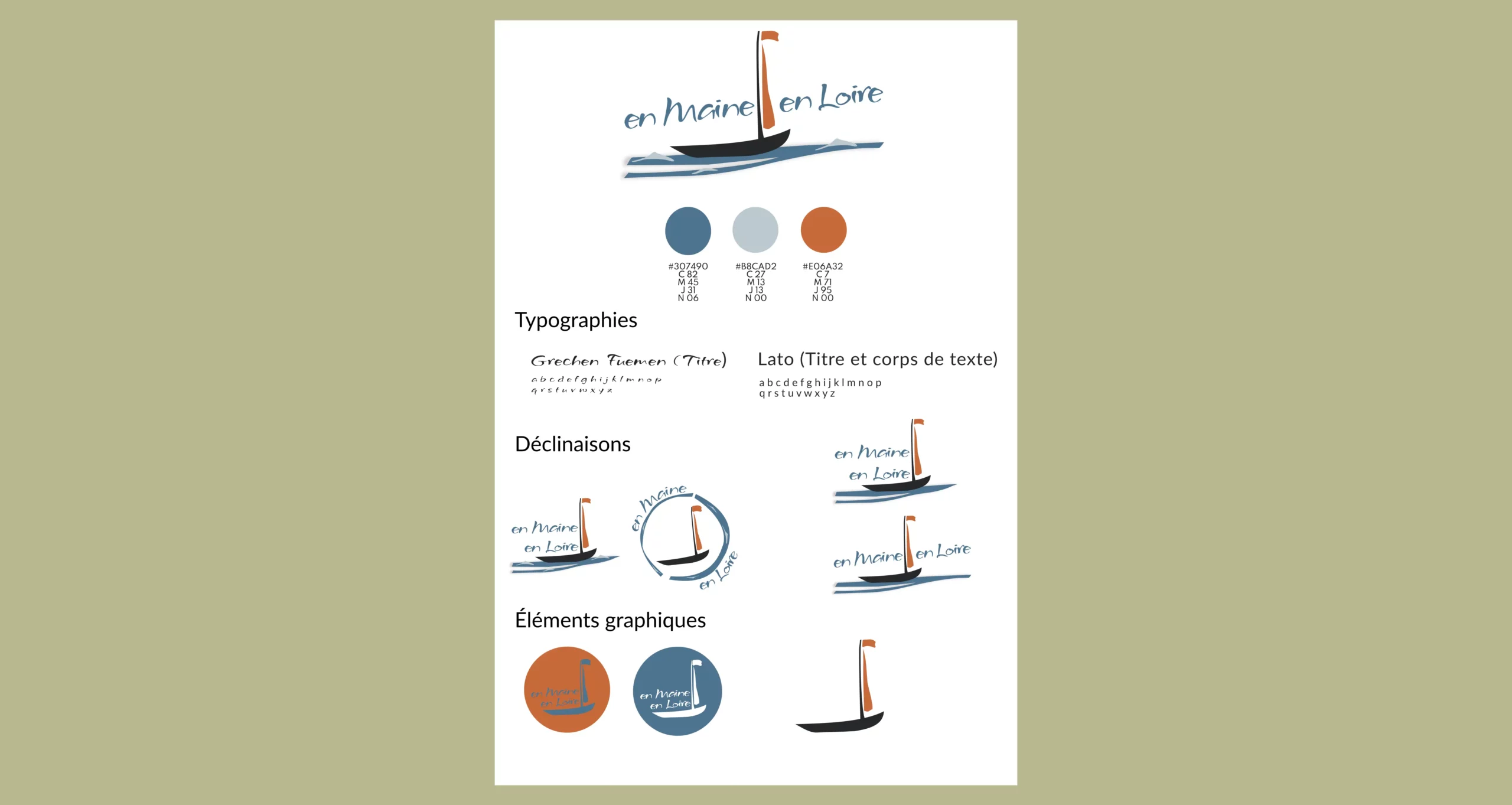 D’après une idée du client, réalisation du logo dont le bateau est l’élément central, l’embouchure de la Maine dans la Loire est stylisé et permet de créer du mouvement pour symboliser la balade en bateau. Les couleurs choisies sont 2 tons de bleus pour l’eau associé à un orange rappelant la couleur de la voile du bateau.