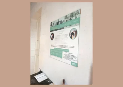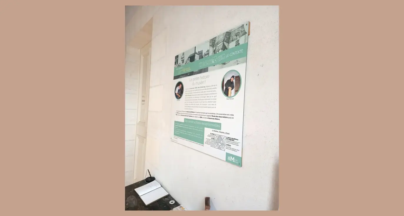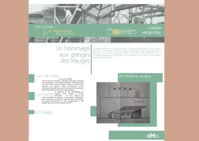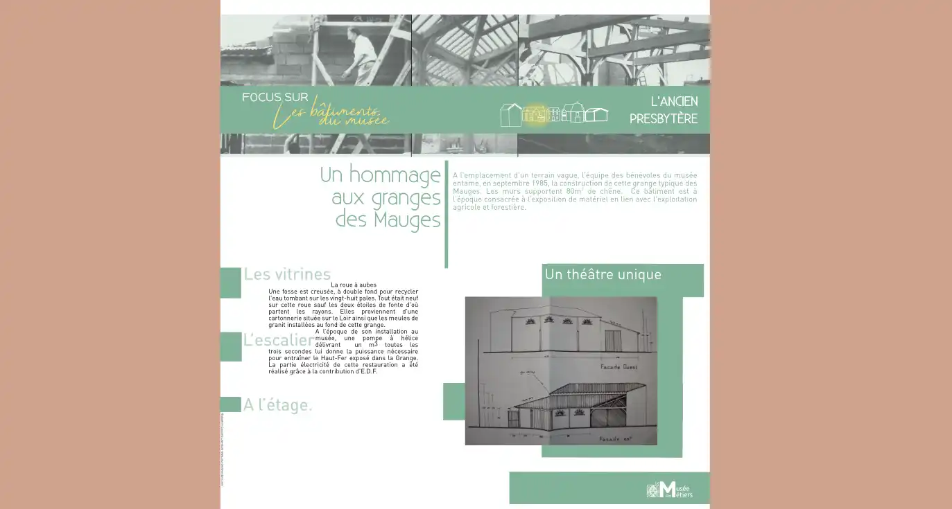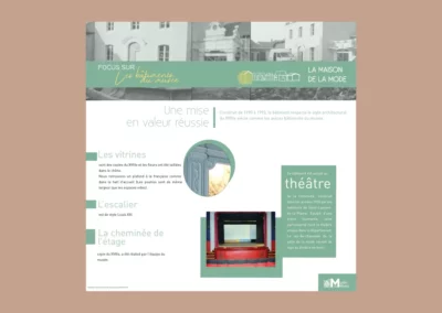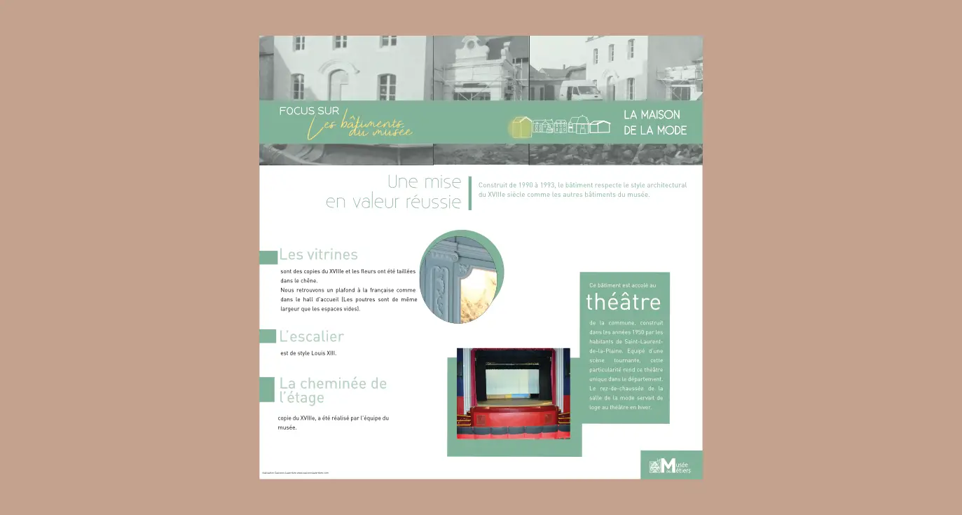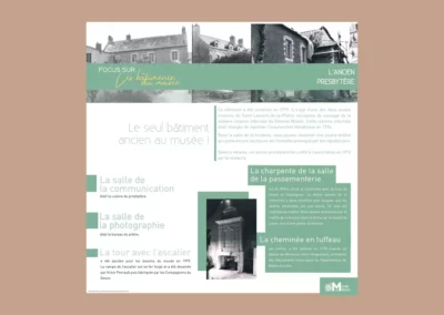 Les huits panneaux du Musée sont réalisés en utilisant le même code couleur ainsi que le même gabarit. Le choix de la couleur s’est fait pour être se différencié des autres panneaux déjà présents, tout en s’accordant avec. J’ai réalisé un logo pour le parcours intitulé « Focus sur les bâtiment du musée » ainsi qu’une frise qui permet de repérer dans quel bâtiment on se situe, ils sont présents tous les deux sur les huit panneaux. Chaque panneau a sa spécificité lié au bâtiment et en fonction du nombre de photos d’archives à présenter sur le panneau.