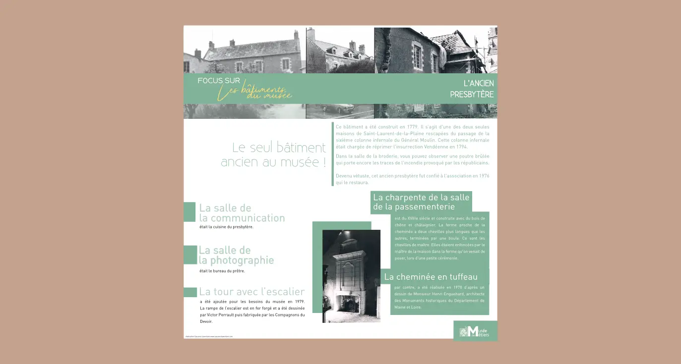Le Muése des Métiers situé à Saint-Laurent de la Plaine existe de plus de 40 ans et refait régulièrement sa muséographie. Le musée s’étend sur près de 5000 m2 avec plusieurs bâtiments dans des styles architecturaux remarquables qui n’étaient pas mis en avant. En 2022, le Musée des Métiers décide de mettre en place un parcours architecture avec 8 panneaux.